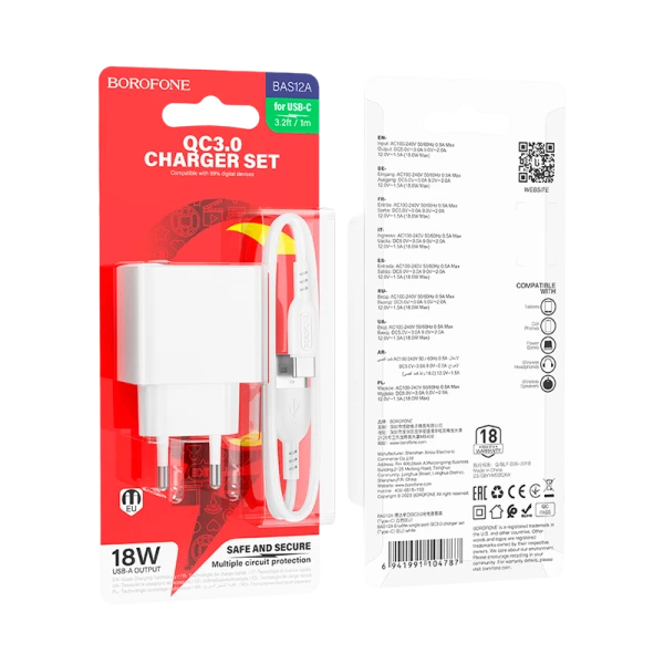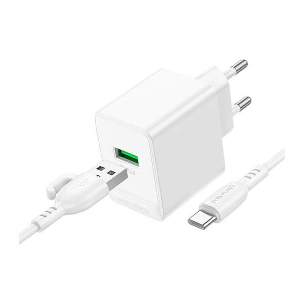 Сетевое З/У Borofone BAS12A 1USB 3.0A 18W QC3.0 с кабелем Type-C белый (1/48/192)