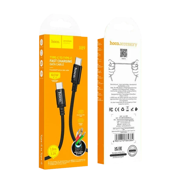 Кабель HOCO X89 Type-C (m)-Type-C (m) 1.0м 3.0A 60W нейлон черный;