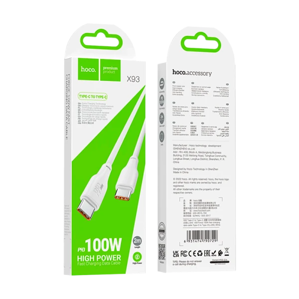 Кабель HOCO X93 Type-C (m)-Type-C (m) 1.0м 3.0A 100W TPE белый;
