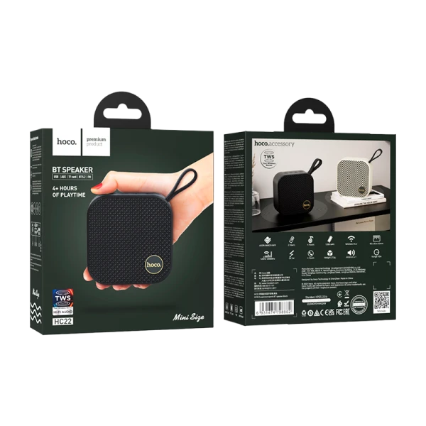 Портативная колонка HOCO HC22, емкость аккумулятора составляет 1200 мАч, что позволяет активно пользоваться колонкой на протяжении 4 часов без подзарядки. Поддерживает беспроводное соединение версии Bluetooth 5.2, а также FM радио, TF-карты, U-диск, AUX, и TWS.
