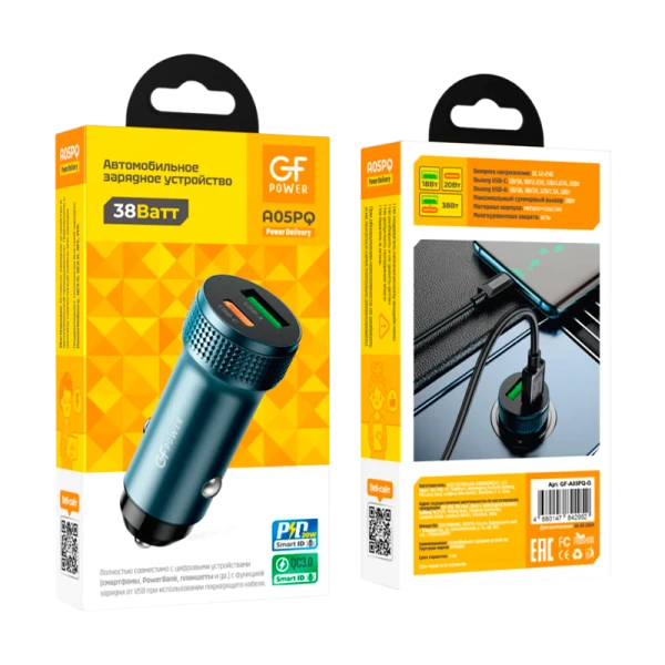 Автомобильное З/У GFPower A05PQ 1USB+1Type-C 38W PD,QC серый;