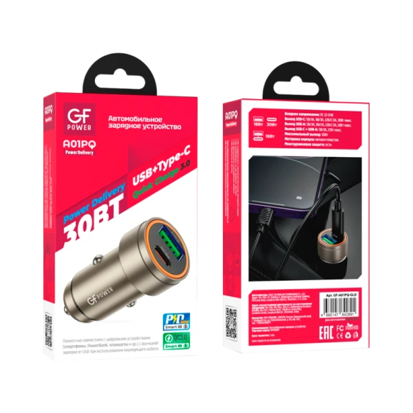 Автомобильное З/У GFPower A01PQ 1USB+1Type-C 30W PD,QC золотой; Поддерживает технологии быстрой зарядки: PD30W, PPS, QC3.0, AFC, FCP; Полностью совместимо с цифровыми устройствами (смартфоны, PowerBank, планшеты и др.) с функцией зарядки от USB при использовании подходящего кабеля.