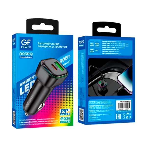 Автомобильное З/У GFPower A03PQ 1USB+1Type-C 30W RGB черный;