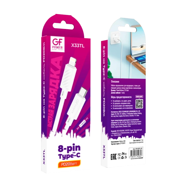 Кабель GFPower X33TL Type-C (m)-Lightning (m) 1.0м 20W ПВХ белый;