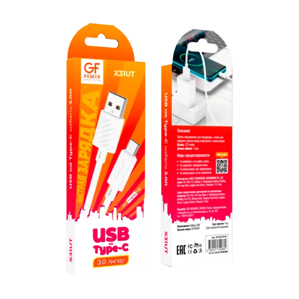 Кабель GFPower X31UT USB (m)-Type-C (m) 1.0м 3.0A ПВХ белый;