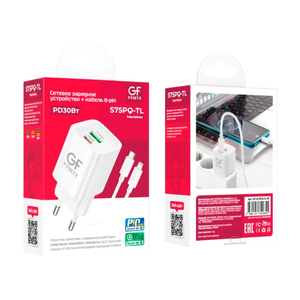 Сетевое З/У GFPower S75PQ-TL 1USB+1Type-C 30W QC3.0 с кабелем Type-C-Lightning белый; Полностью совместимо с цифровыми устройствами (смартфоны, PowerBank, планшеты и др.) с функцией зарядки от USB при использовании подходящего кабеля.