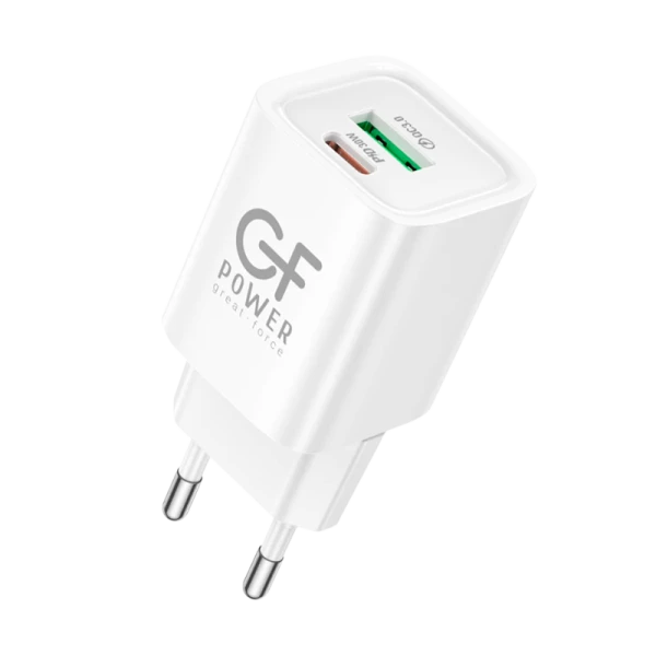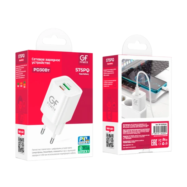 Сетевое З/У GFPower S75PQ 1USB+1Type-C 30W QC3.0 белый; Полностью совместимо с цифровыми устройствами (смартфоны, PowerBank, планшеты и др.) с функцией зарядки от USB при использовании подходящего кабеля. Поддерживает выходной ток до 20 Вольт для быстрой зарядки мощностью PD 30 Ватт и QC3.0 18 Ватт;