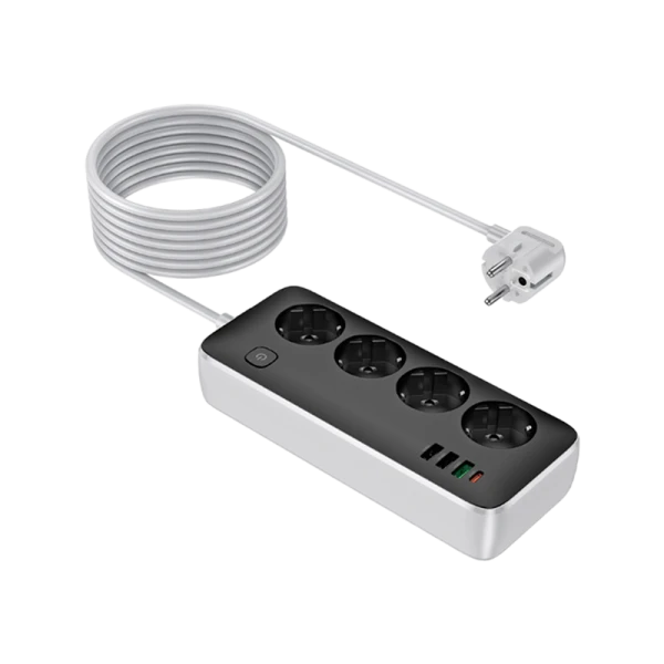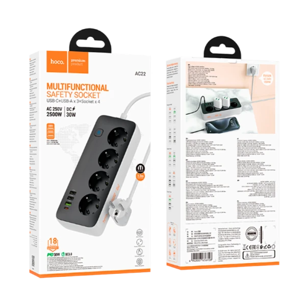 Сетевой фильтр оснащен четырьмя розетками, что обеспечивает возможность подключения сразу нескольких устройств. Это особенно удобно, если вам нужно одновременно заряжать несколько устройств или использовать их в качестве источника питания для других приборов. HOCO AC22 поддерживает функцию "быстрой зарядки" PD30W. Это означает, что вы можете быстро зарядить свои устройства, экономя время и энергию.
