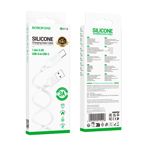 Кабель Borofone BX113 USB (m)-Type-C (m) 1.0м 3.0A силикон белый;