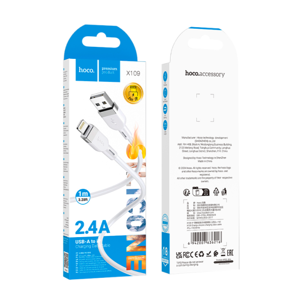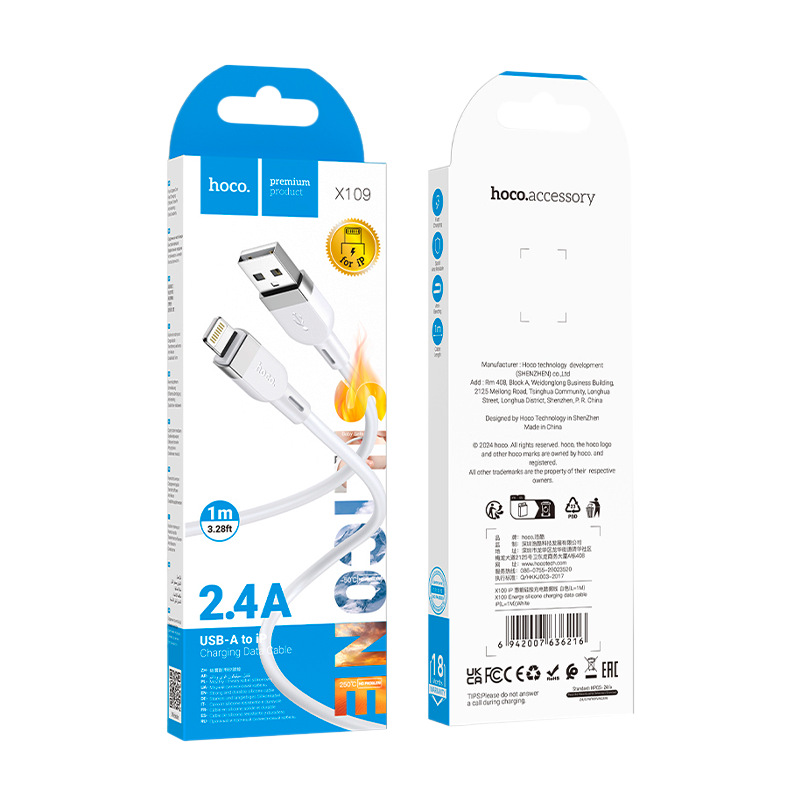 Кабель HOCO X109 USB (m)-Lightning (m) 1.0м 2.4A силикон белый;