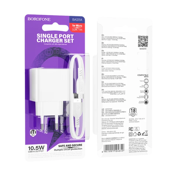 Сетевое З/У Borofone BAS11A 1USB 2.1A 10.5W с кабелем microUSB белый (1/54/216)