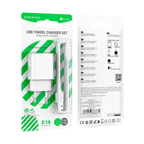 BOROFONE BA74A Aspirer, сетевое зарядное устройство, один выход USB 5V / 2.1A, вилка EU, набор с кабелем для USB-C.