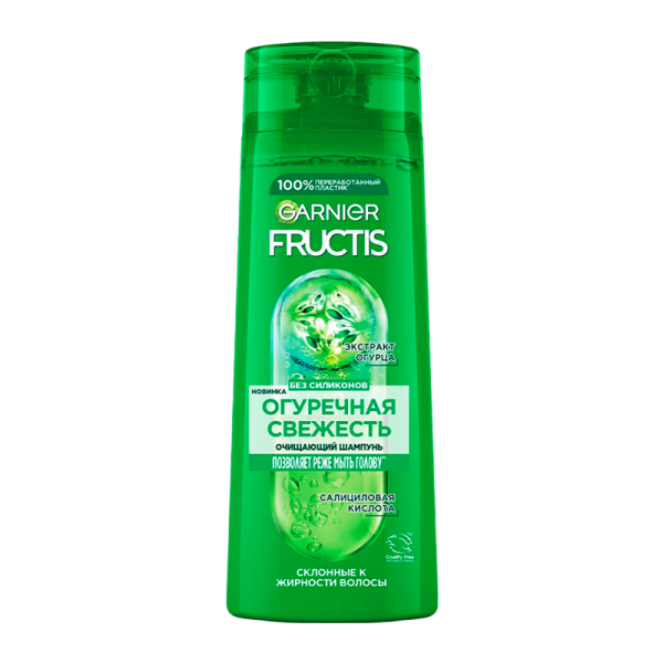 Шампунь, продлевающий свежесть волос. Специально создан для волос, склонных к жирности и быстрому загрязнению. Благодаря уникальной комбинации экстракта огурца и витаминов B3 и B6 шампунь Fructis Огуречная свежесть надолго очищает волосы и кожу головы, способствует укреплению волосяных луковиц и росту более сильных волос. Активный концентрат фруктов в составе обеспечивает антиоксидантную защиту, делает волосы плотными и блестящими.