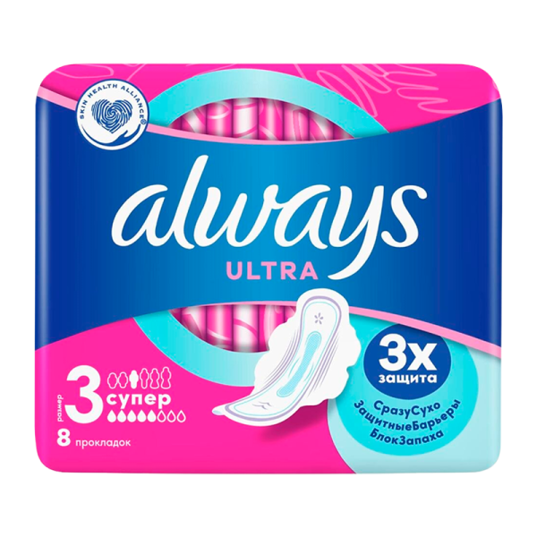 Тройная защита от Always — не соглашайтесь на меньшее: в Always Ultra «Супер» (Размер 3) с крылышками используется новейшая технология для создания многофункциональной гигиенической прокладки с 3 элементами защиты. Система «Сразу сухо» впитывает влагу за считаные секунды и не дает ей соприкасаться с кожей. Технология «Защитные барьеры» удерживает жидкость, предотвращая протекания. Технология «Блок запаха» нейтрализует неприятные запахи, придавая ощущение свежести и чистоты во время менструации. С Always Ultra вы можете чувствовать себя уверенно весь день. Тройная защита от Always — не соглашайтесь на меньшее.