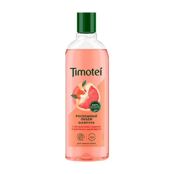 Шампунь Timotei (Тимотей) "Роскошный объем", 400 мл, создан для тонких волос лишенных объема, с ним ваши волосы становятся более густыми и полными объема. Особая формула, обогащенная экстрактом семян гуараны и розового грейпфрута, обладает легкой текстурой, не утяжеляет волосы и придает им удивительную мягкость.