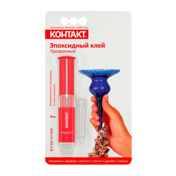 Клей эпоксидный Контакт, прозрачный, 4 мл - двухкомпонентный прозрачный эпоксидный клей на основе полиэпоксидной смолы и отвердителя. Предназначен для различного домашнего ремонта.