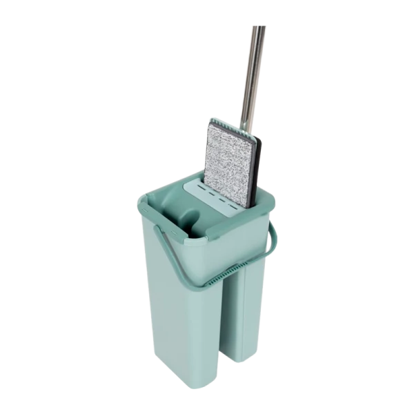 Не требует применения химических средств. Ведро состоит из двух отсеков: для мытья и отжима. В одном отсеке ведра вы поласкаете тряпку из микрофибры прямо на швабре, в другом отсеке вы отжимаете тряпку без прикосновения к самой тряпке из микрофибры.