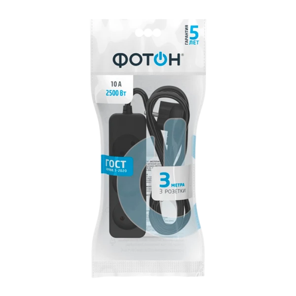 Удлинитель сетевой "ФОТОН" 10-33 - это простая, но надёжная и безопасная модель по самой выгодной цене. Предназначена для подключения электроприборов суммарной мощностью до 2500Вт. Колодка с 3 розетками и длиной провода 3 метра. Полностью соответствует нормам ГОСТ и ЕАС. Предоставляется безусловная гарантия 5 лет. Корпус изготовлен из термоустойчивого и ударопрочного пластика. Контактная группа из латуни обеспечивает высокую электропроводность и максимально плотный контакт со штырями вилок подключаемых приборов. Гнездовые контакты расположены под углом для одновременного подключения нескольких приборов. Подходят для подключения вилок российского и европейского стандарта. Провод ПВС с медной токопроводящей жилой и двойной ПВХ изоляцией устойчив к нагреву и обладает повышенной гибкостью. Удлинитель чёрного цвета идеально подходит для подключения приборов с проводами чёрного цвета, для использования в интерьерах тёмных тонов, а также при раз мещении на полу в помещениях, склонных к загрязнению.
