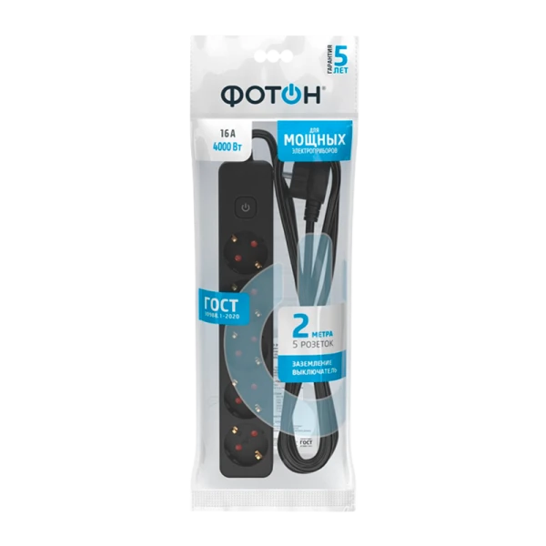 Удлинитель сетевой "ФОТОН" 16-25ES с заземлением предназначен для подключения электроприборов суммарной мощностью до 4000Вт. Оснащен выключателем, позволяющим обесточить все разъемы одним нажатием кнопки. Снабжены защитными шторками, прикрывающими контакты, для обеспечения дополнительной безопасности. Колодка с 5 розетками и длиной провода 2 метра. Полностью соответствует нормам ГОСТ и ЕАС. Корпус изготовлен из термоустойчивого и ударопрочного пластика. Контактная группа из латуни обеспечивает высокую электропроводность и максимально плотный контакт со штырями вилок подключаемых приборов. Гнездовые контакты расположены под углом для одновременного подключения нескольких приборов.