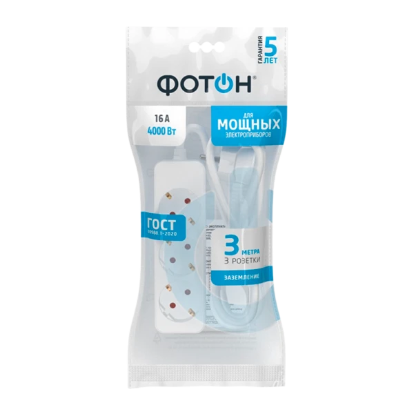 Удлинитель сетевой "ФОТОН" 16-33E с заземлением предназначен для подключения электроприборов суммарной мощностью до 4000Вт. Снабжены защитными шторками, прикрывающими контакты, для обеспечения дополнительной безопасности. Колодка с 3 розетками и длиной провода 3 метра. Полностью соответствует нормам ГОСТ и ЕАС. Предоставляется безусловная гарантия 5 лет. Корпус изготовлен из термоустойчивого и ударопрочного пластика. Контактная группа из латуни обеспечивает высокую электропроводность и максимально плотный контакт со штырями вилок подключаемых приборов. Гнездовые контакты расположены под углом для одновременного подключения нескольких приборов. Подходят для подключения вилок российского и европейского стандарта. Провод ПВС с медной токопроводящей жилой и двойной ПВХ изоляцией устойчив к нагреву и обладает повышенной гибкостью. Удлинитель белого цвета подходит для большинства ситуаций домашнего использования.