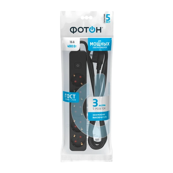 Удлинитель сетевой "ФОТОН" 16-35ES с заземлением предназначен для подключения электроприборов суммарной мощностью до 4000Вт. Оснащен выключателем, позволяющим обесточить все разъемы одним нажатием кнопки. Снабжены защитными шторками, прикрывающими контакты, для обеспечения дополнительной безопасности.