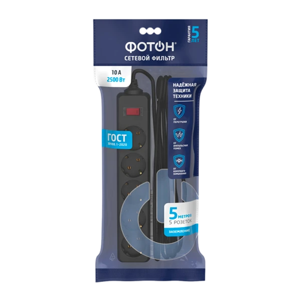 Сетевой фильтр предназначен для подключения нескольких электроприборов и их защиты от перегрузки, короткого замыкания и импульсных помех. Обеспечивает необходимую защиту бытовой, офисной и компьютерной техники. Варистор для защиты от перегрузки и импульсных помех. Выключатель со встроенным терморазмыкателем для защиты от коротких замыканий и отключения устройств при превышении расчетной мощности сетевого фильтра.