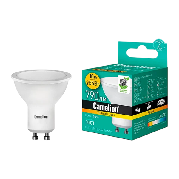 Camelion LED10-GU10/830/GU10 – светодиодная лампа мощностью 10Вт. Отличается высоким световым потоком 790 лм и цветовой температурой 3000K. Идеально подходит для дома и офиса.