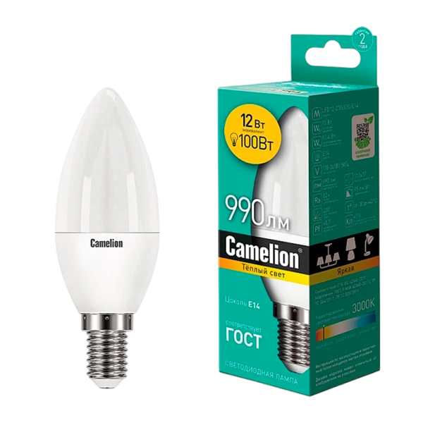 Лампа светодиодная Camelion C35 E14 12W 3000К 170-265V свеча матовая (1/10/100)