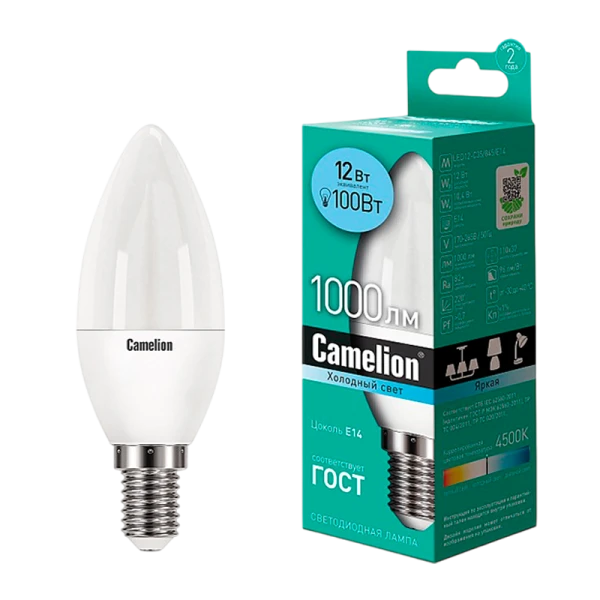 Светодиодная лампа Camelion LED12-C35/845/E14 мощностью 12Вт, с цоколем E14 и матовым стеклом, идеально подходит для офисного и коммерческого освещения. СДЛ Camelion - это инновационное решение, разработанное на основе жилых, новейших светодиодных технологий (LED).