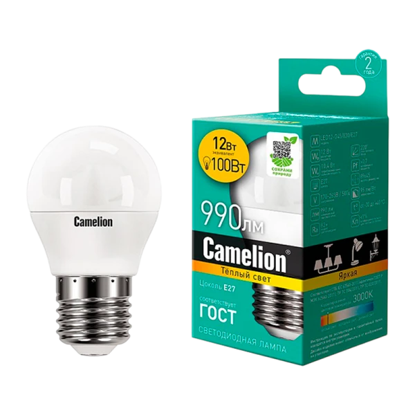 Светодиодная лампа Camelion LED12-G45/830/E27 мощностью 12Вт с цоколем E27 идеально подойдет для освещения жилых, офисных и коммерческих помещений.