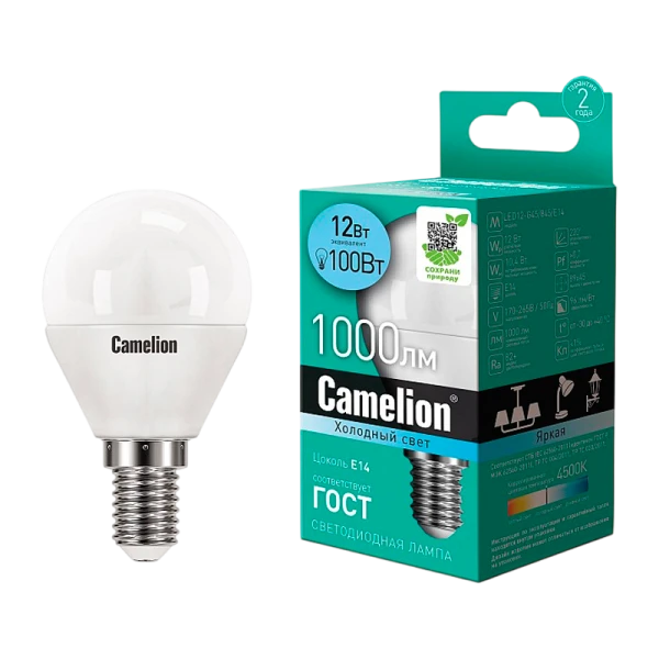 Светодиодная лампа Camelion LED12-G45/845/E14 12Вт 220В - отличное решение для освещения жилых, офисных и коммерческих помещений. СДЛ Camelion - это инновационное решение, разработанное на основе новейших светодиодных технологий (LED). Встроенный источник питания позволяет использовать Camelion в стандартных патронах.