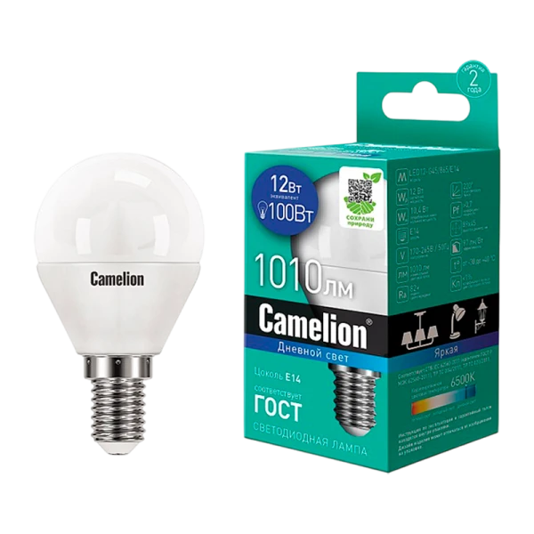 Светодиодная лампа Camelion LED12-G45/865/E14 мощностью 12 Вт предназначена для освещения жилых, офисных и коммерческих помещений. Обеспечивает яркий свет 6500K и световой поток 1010 лм.