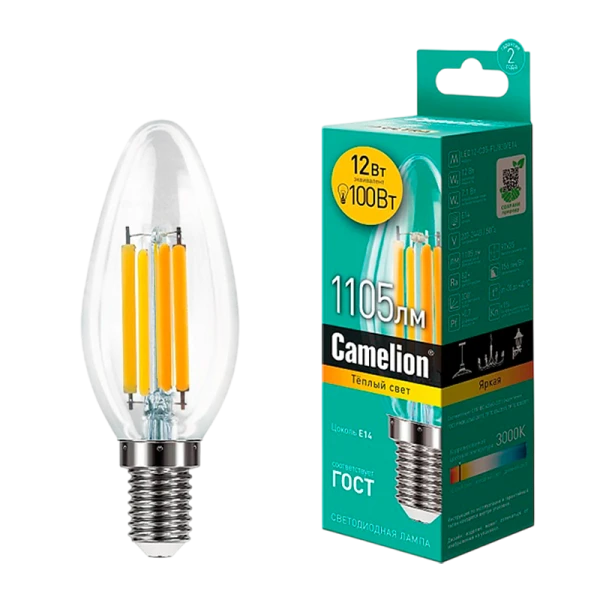 Лампа светодиодная филамент Camelion C35 E14 12W 3000К 207-244V свеча прозрачная (1/10/100)