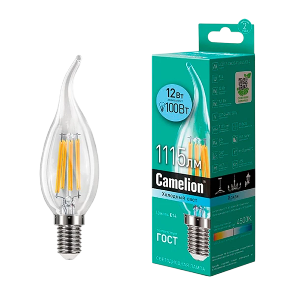 Светодиодная лампа Camelion LED12-CW35-FL/845/E14 мощностью 12Вт и цветовой температурой 4500K. Подходит для освещения офисных и коммерческих помещений.
