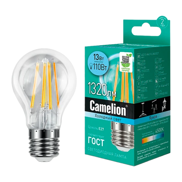 Светодиодная лампа Camelion LED13-A60-FL/845/E27 мощностью 13Вт идеально подходит для освещения жилых, офисных и коммерческих помещений. Обеспечивает яркий свет с цветовой температурой 4500K.
