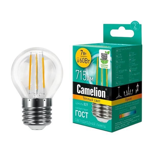 Светодиодная лампа Camelion LED7-G45-FL/830/E27 мощностью 7Вт и цветовой температурой 3000K идеально подходит для домашнего и офисного освещения. СДЛ Camelion - это инновационное решение, разработанное на основе новейших светодиодных технологий (LED).