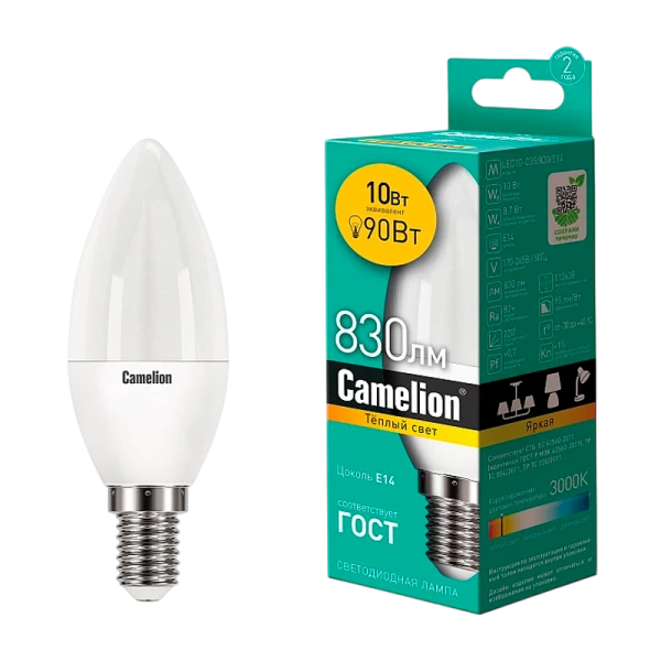 Светодиодная лампа Camelion LED10-C35/830/E14 мощностью 10Вт с цоколем E14 и цветовой температурой 3000K идеально подходит для освещения жилых, офисных и коммерческих помещений.
