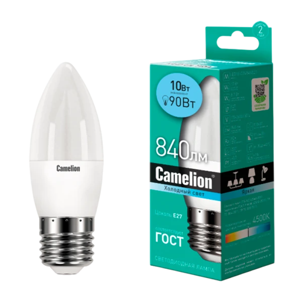 Светодиодная лампочка Camelion LED10-C35/845/E27 используется в люстрах, бра, светильниках и других бытовых осветительных приборах. Форма колбы - свеча, соответствует маркировке С35.
