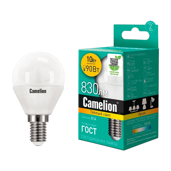 LED лампа Camelion LED10-G45/830/E14 мощностью 10Вт с цветовой температурой 3000K и световым потоком 830 лм. СДЛ Camelion - это инновационное решение, разработанное на основе новейших светодиодных технологий (LED). Предназначена для освещения жилых, офисных и коммерческих помещений. Встроенный источник питания позволяет использовать СДЛ Camelion в стандартных патронах.