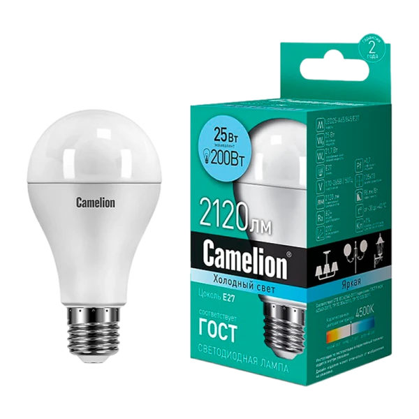 Светодиодная лампа Camelion LED25-A65/845/E27 мощностью 25Вт идеально подходит для освещения жилых, офисных и коммерческих помещений. СДЛ Camelion - это инновационное решение, разработанное на основе новейших светодиодных технологий (LED). Встроенный источник питания позволяет использовать СДЛ Camelion в стандартных патронах.