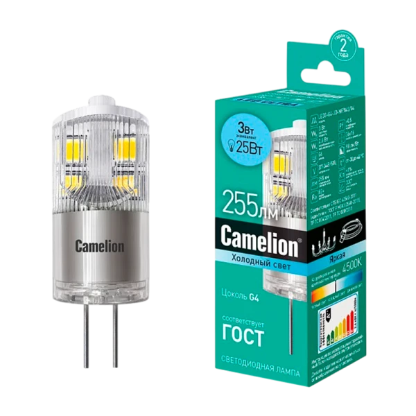 Светодиодная лампа Camelion LED3-G4-JD-NF/845/G4 мощностью 3Вт и напряжением 220В. Идеальна для освещения жилых, офисных и коммерческих помещений. СДЛ Camelion - это инновационное решение, разработанное на основе новейших светодиодных технологий (LED). Предназначена для освещения жилых, офисных и коммерческих помещений. Встроенный источник питания позволяет использовать СДЛ Camelion в стандартных патронах.