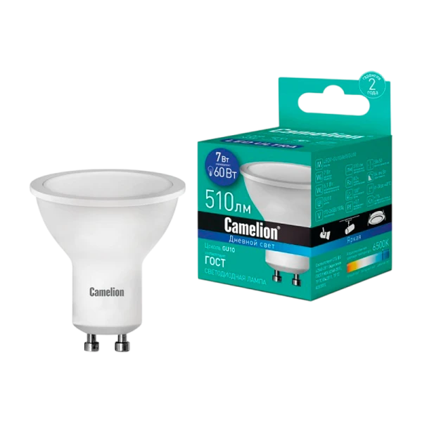 Светодиодная лампа Camelion LED7-GU10/865/GU10 мощностью 7Вт с цоколем GU10. Идеально подходит для домашнего и офисного освещения, световой поток 510 лм.