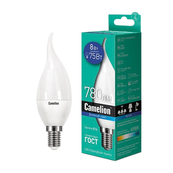 Светодиодная лампа Camelion LED8-CW35/865/E14 на 8Вт с цоколем E14 и цветовой температурой 6500K. СДЛ Camelion - это инновационное решение, разработанное на основе жилых, новейших светодиодных технологий (LED). Предназначена для освещения офисных и коммерческих помещений. Встроенный источник питания позволяет использовать СДЛ Camelion в стандартных патронах.