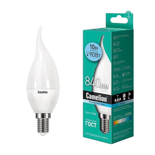 Светодиодная лампа Camelion LED10-CW35/845/E14 на 10 Вт с цветовой температурой 4500K и цоколем E14 идеально подходит для офисных и коммерческих помещений.
