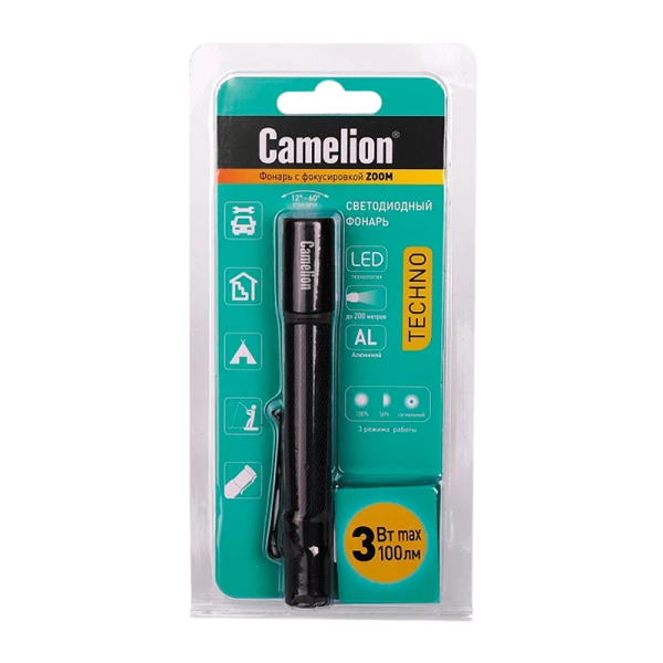 Фонарь ручной Camelion LED51533 LED от батареек 2хААA 3 режима+ZOOM черный (1/6/36)