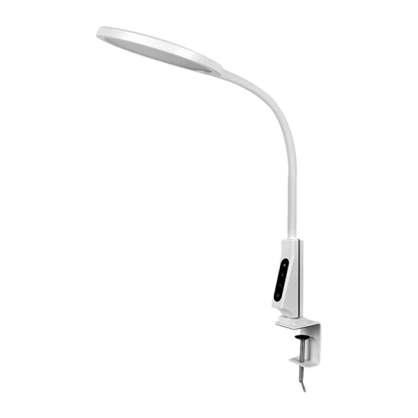 Светодиодный настольный светильник на струбцине Camelion KD-837 может использоваться в качестве источника местного освещения как в домашних помещениях, так в офисных и учебных учреждениях. Мощность 7Вт, яркость 450 лм, с высоким индексом цветопередачи (Ra > 85). Светильник имеет пять уровней регулировки яркости и пять режимов цветовой температуры (от 3000К до 6000К). Сенсорная панель управления световыми режимами находится на нижней части стойки. Светильник имеет USB-разъём 5В, 1А. Гибкая металлическая стойка имеет силиконовое покрытие. Мощная металлическая струбцина надежно фиксирует светильник на любой поверхности толщиной до 6,5 см. Пластиковый плафон имеет форму диска диаметром 16 см. Максимальная высота плафона над уровнем стола в рабочем положении ~ 42 см. Длина провода питания – 150 см.