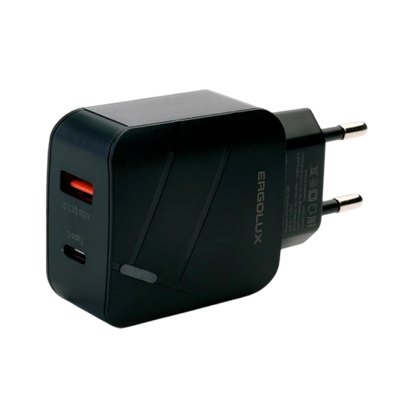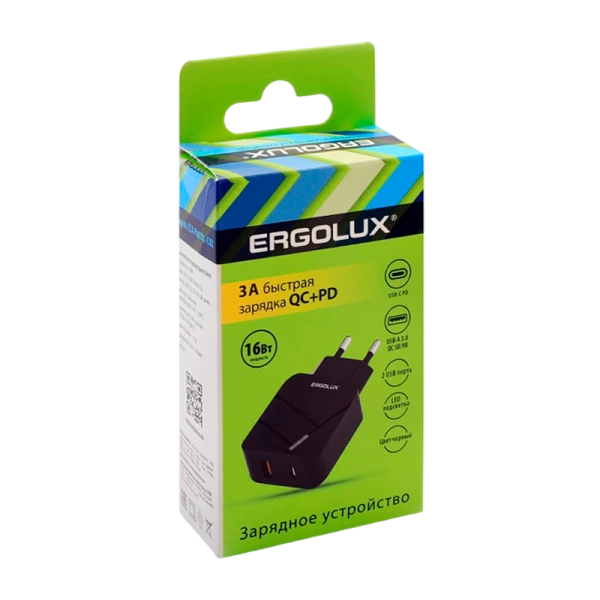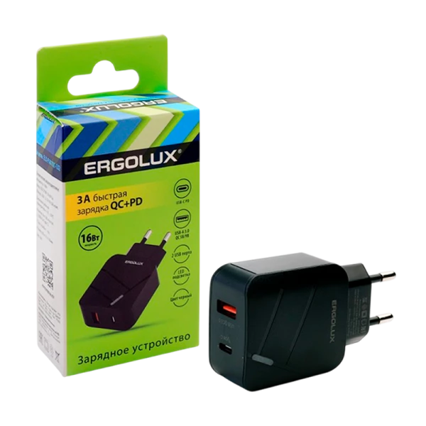 Сетевое З/У Ergolux ELX-РA01QC-C02 1USB+1Type-C 3.0A 18W PD,QC черный (1/10/240)