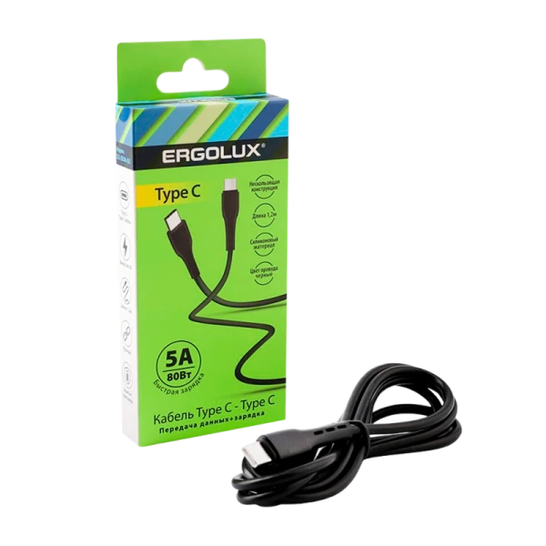 Кабель ERGOLUX ELX-CDC06-C02 Type C-Type C на 5А и 80Вт, длиной 1,2 метра. Идеален для быстрой зарядки и передачи данных.