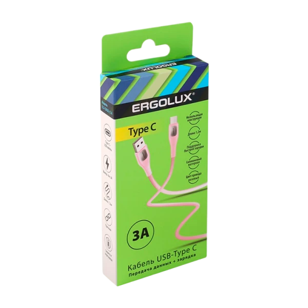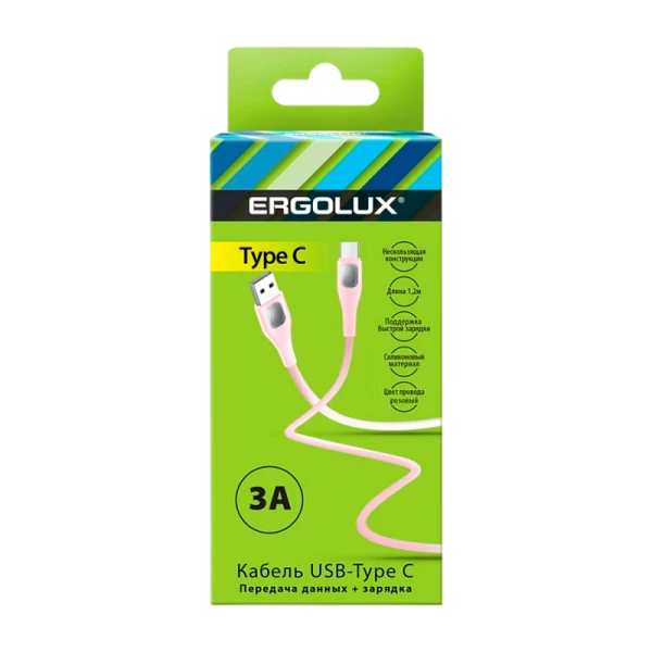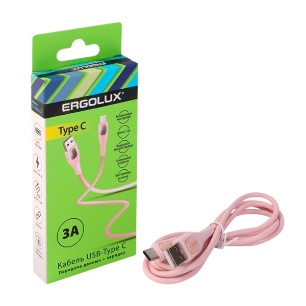 Розовый кабель ERGOLUX ELX-CDC02-C14 Type C обеспечит быструю зарядку и передачу данных. Сила тока 3А. Длина 1,2 метра.