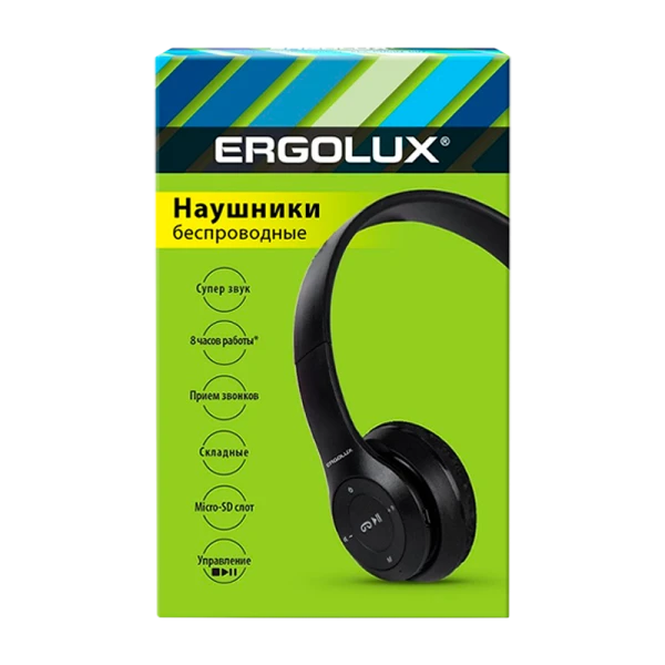 Беспроводные черные наушники Ergolux ELX-BTHP01-C02 предлагают до 8 часов работы, качественный звук и множество функций: FM радио, MP3 плеер, микрофон и поддержка Bluetooth 5.3. Отличный выбор для прослушивания музыки и звонков на ходу. Зарядка занимает 2 часа.